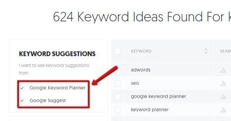 By default, Ubersuggest aggregates keyword suggestions from the AdWords Keyword Planner and Google Suggest. You can include or exclude either source via the checkboxes to the left of the keyword results.