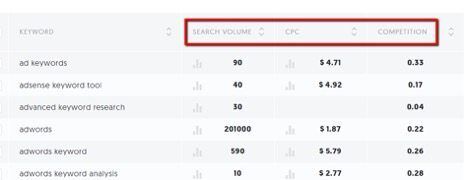 In the results page of Ubersuggest, you’ll notice three more columns alongside the keyword suggestions: search volume, CPC, and competition.