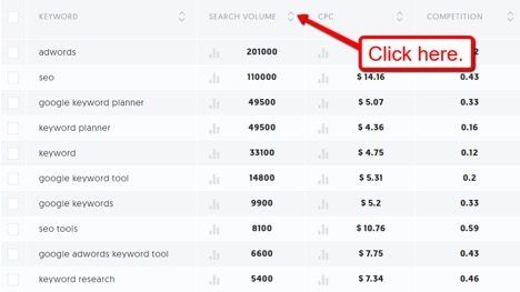 For instance, if you want to focus on keywords with a high monthly search volume, click on the “up” arrowhead next to the “Search Volume” header.