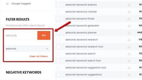 The first option is to pick out keywords that contain a specific term. For this, enter another keyword in the “Filter Results” box and click the “Go” button.